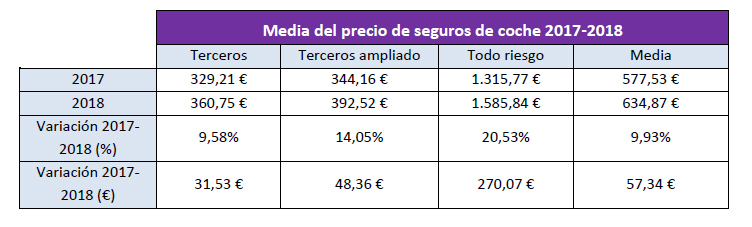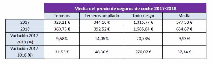 En este último año, la modalidad de seguro de Coche a todo riesgo es la que más ha aumentado su precio con respecto a 2017, con un incremento del 20,53%, lo que equivale a una prima 270,07 euros más cara. En 2018, la prima media del seguro a todo riesgo se situó en 1.585,84 euros. Los seguros a terceros ampliados (que incluyen daños por robo, incendio y cobertura de lunas) han registrado un aumento del 14,05% con respecto a 2017, con una prima media de 392,52 euros. Por último, los seguros a terceros básicos también han visto incrementado su precio con respecto a 2017, con un aumento en su prima media del 9,58%, situándose en los 360,75 euros.