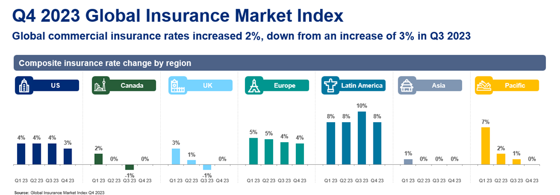 En términos generales, los precios de los seguros se mantuvieron estables en el cuarto trimestre en Reino Unido, Canadá, Asia y en el área del Pacífico. En concreto, los precios aumentaron un 3% en EE. UU.; un 4% en Europa, India, Oriente Medio y África; y un 8% en América Latina y el Caribe.