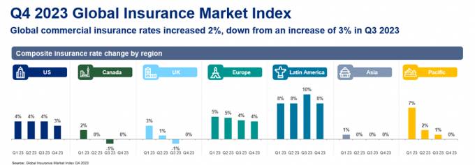 Al cierre del cuarto trimestre de 2023, los precios de los seguros comerciales aumentaron un 2%, un punto menos que el incremento registrado en el trimestre anterior. En cualquier caso, ya van 25 trimestres consecutivos con los precios al alza. Así se desprende del Índice Global del Mercado de Seguros publicado por Marsh.
