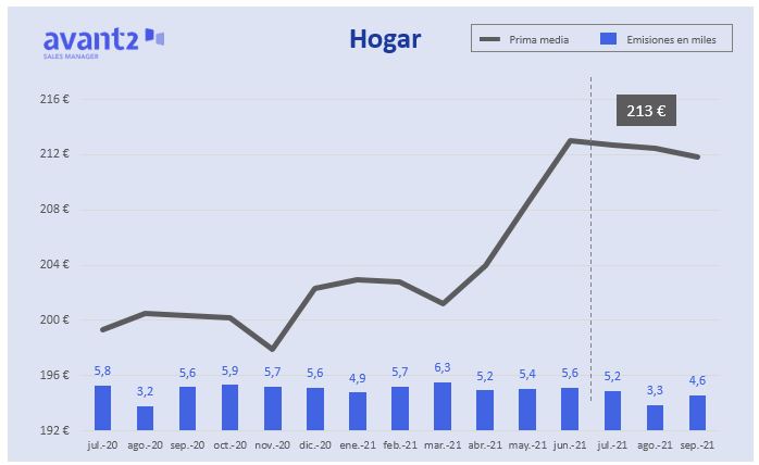 Por último, según se constata en la cartera de Avant2, la prima media del seguro de Hogar se mantiene alrededor de los 213 euros, dando continuidad así a la fuerte subida experimentada entre abril y junio. Por el contrario, el número de pólizas emitidas ha bajado un 10% respecto al mismo periodo de 2020 por los efectos de la crisis sanitaria aunque en el acumulado del año continúa en línea ascendente (+4,6%).