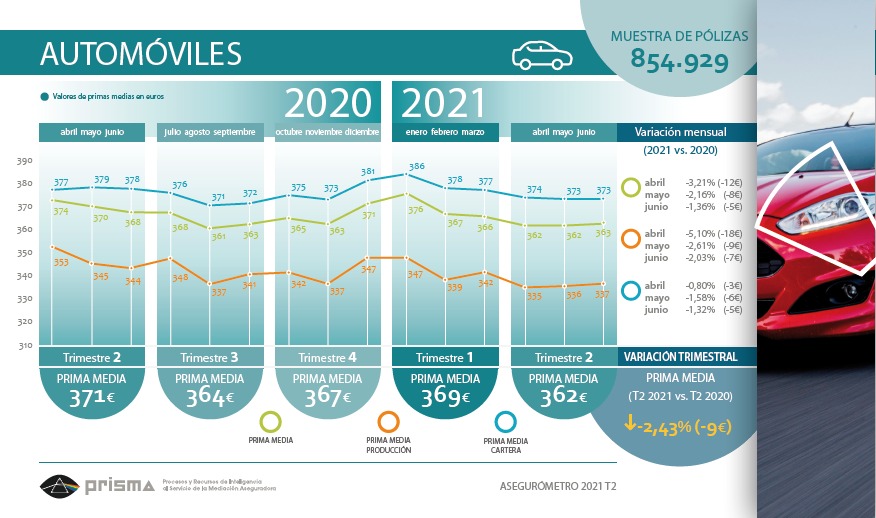 ramo de automóviles entre abril y junio fue de 362 euros frente a los 371 del primer trimestre, lo que muestra una caída en la prima de casi el 2,5%. Si analizamos los datos de manera interanual, en el 2T de 2020 la prima media de este ramo alcanzaba los 371 euros frente a los 362 de ahora.