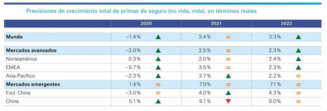 El repunte estará liderado por los mercados emergentes, principalmente por Asia emergente, con una previsión de aumento de las primas del 6,9 % en 2021 (y del 8,5 % en China). La mayor concienciación del riesgo después de la Covid-19 será un factor principal de la recuperación del sector.