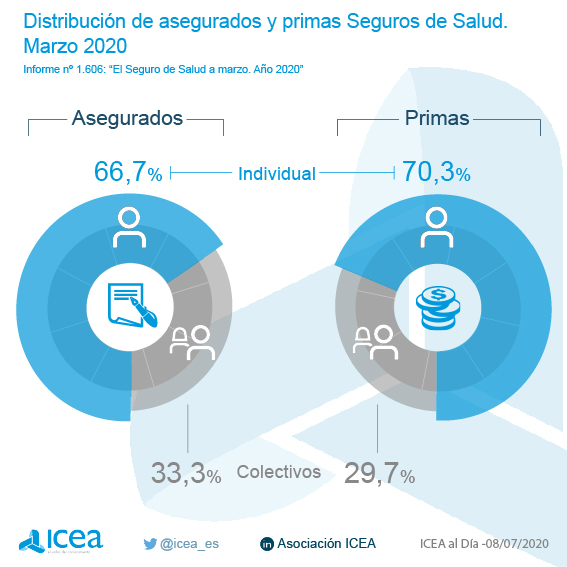 Los datos de ICEA confirman que los seguros individuales supusieron un 70,3% de la recaudación y un 66,7% de los asegurados de Salud. Dentro del crecimiento mostrado de enero a marzo los seguros colectivos crecieron un 6,5% en primas, frente a un crecimiento del 5,9% de los seguros individuales.