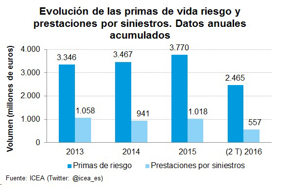 Las primas de seguros de Vida Riesgo han alcanzado los 2.465 millones de euros a junio de 2016, lo que supone un crecimiento del 16,46% anual, según los datos de ICEA. Las prestaciones por siniestros ascendieron a 557 millones.