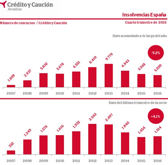Afirma la aseguradora que los primeros trimestres de 2017 serán claves para determinan si se consolida el empeoramiento. Los informes de la aseguradora prevén un estancamiento de estos planes concursales al cierre de 2016 y todo 2017. La concursalidad en España alcanzó su punto más elevado en 2013 con 10.000 procedimientos. Hoy con algo más de 5.000 casos anuales se supera con creces a los 1.000 que se registraban al inicio de la crisis.