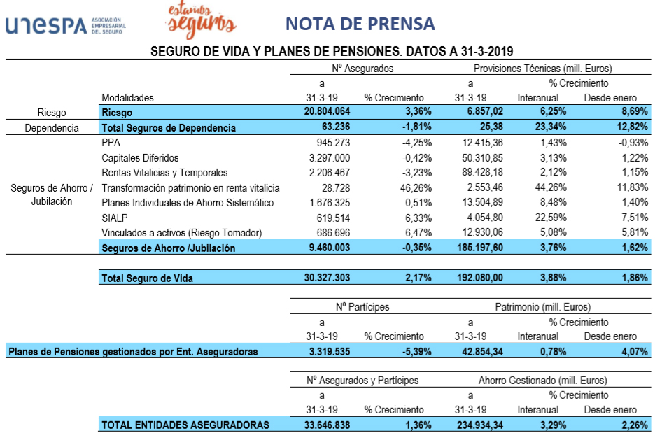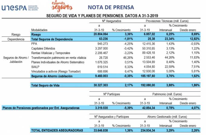 El númeor total de personas que han confiado su patrimonio en alguno de los productos bajo gestión de compañías de seguros alcanza hasta marzo un total de 33,7 millones, lo que supone un crecimiento de casi un 1,4% respecto a marzo de 2018.