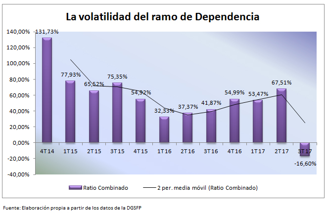 En primer lugar, advierte de que Dependencia es un ramo "muy volátil" ya que "tiene un volumen de primas relativamente bajo y un solo siniestro podría detectarse en las cuentas sectoriales". A 30 de septiembre de 2017 –últimos datos disponibles −, había recaudado 1.926.814 euros y el ranking de la DGSFP sólo incluye dos entidades: PSN, con una cuota de mercado por encima del 90%, y Alter Mutua de Previsión Social para Abogados.
