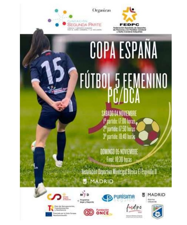 La Copa de España de Fútbol Femenino PC Y DCA se desarrollará los próximos 4 y 5 de noviembre en la Instalación Deportiva Municipal Básica El Espinillo II (Madrid). Contará con la participación de tres equipos: Fundación Segunda Parte DCA, FESA (un combinado de jugadoras de la Comunidad Valenciana) y FECPC (integrado por deportistas de Cataluña).
