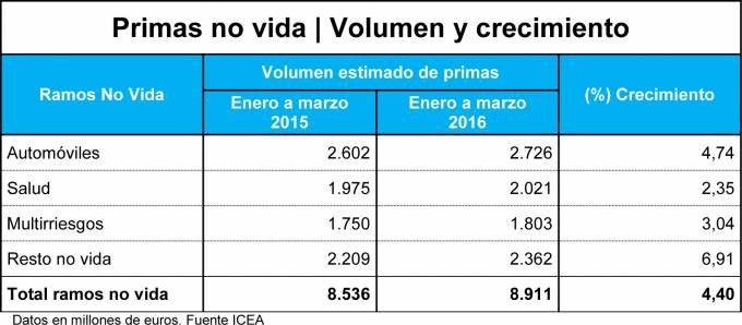 La facturación del ramo de No Vida aumentaba a cierre del primer trimestre un 4,4% en términos interanuales. La mejora de esta actividad se fundamenta en el tirón de las pólizas de Autos y de aquellas ligadas a las industrias. Los seguros de Motor incrementaron su aportación un 4,74%, hasta los 2.726 millones. Entre tanto, la partida de seguros denominada ‘resto No Vida’, que engloba los seguros más ligados a la actividad económica, aumentó su facturación otro 6,91% entre enero y marzo, hasta los 2.362 millones.