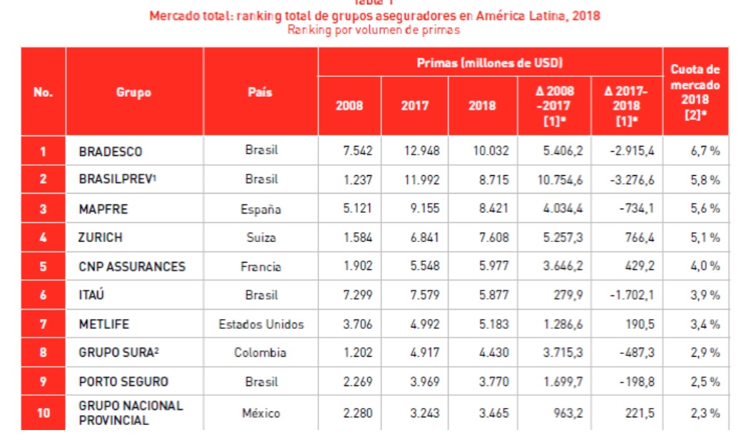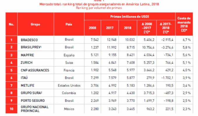 La brasileña Bradesco lidera la clasificación con una cuota del 6,7%, seguida de Brasilprev (5,8%) y Mapfre (5,6%). Respecto a 2017, las dos compañías brasileñas ceden más de un punto porcentual de cuota debido al descenso de sus ingresos por primas medidas en dólares (de 1,5 y 1,8 puntos porcentuales, respectivamente). Entre los líderes, la compañía española, con un volumen de primas de 8.421 millones de dólares, es la que mejor aguanta al ceder solo 0,2 puntos porcentuales frente al ejercicio previo y se acerca a la segunda posición.