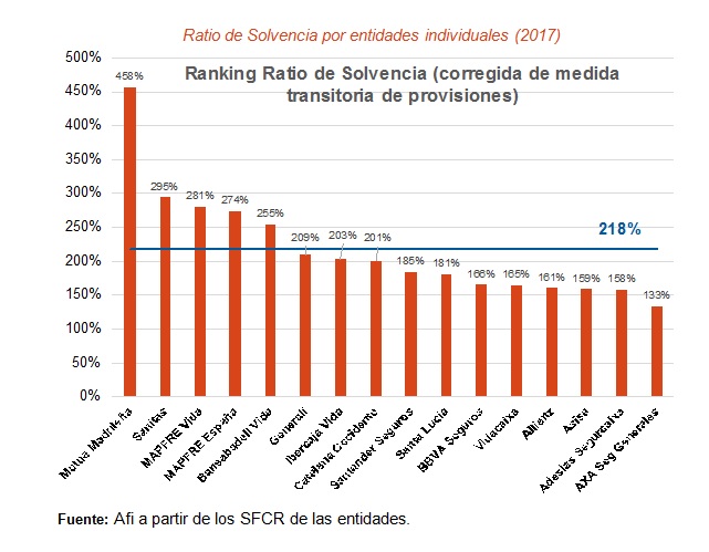 La ratio de solvencia media del sector asegurador español se encuentra en el 218%, sin tener en cuenta las medidas transitorias que permite Solvencia II. Teniéndo en cuenta estas medidas especiales la ratio se elevaría al 238%, cifra similar al resto del mercado asegurador europeo. Por lo tanto, las compañías individuales disponen de un capital que dobla el que exige el marco regulatorio vigente. Esta es una de las conclusiones de los datos del Informe sobre la situación Financiera y de Solvencia (SFCR) que las entidades han presentado reciente y que Analistas Financieros Internacionales (AFI) ha analizado. Para este cómputo utilizan a 16 compañías que representan el 60% del mercado.
