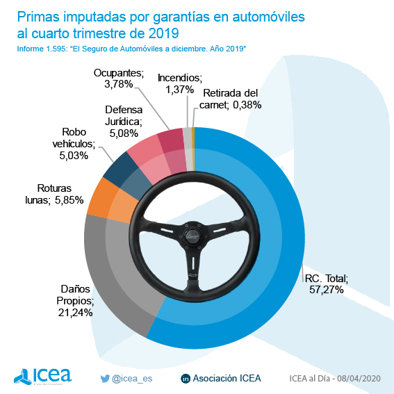 Los datos de ICEA confirman que Autos supuso el 31% de la cuota de No Vida en 2019 y, dentro del ramo, la garantía de RC acaparó el 57,27% de las primas imputadas para el conjunto de vehículos, mientras Daños propios lo hizo con el 21,24%. "Por categorías de vehículos, los de 1ª aglutinaron el 89% de las primas, repartiéndose el 7% y 4% entre la 2ª y 3ª respectivamente. Las matriculaciones de vehículos cayeron un 2,1%, principalmente por el descenso en la matriculación de turismos que bajaron un 3,5%", precisa ICEA.