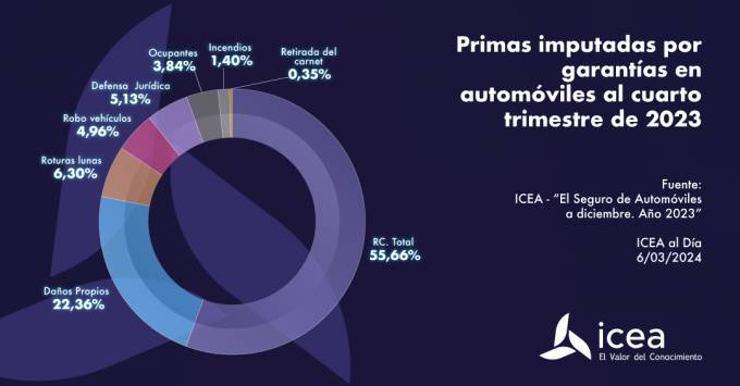 Dentro de los seguros de Autos, la 1ª categoría acaparó al cierre de 2023 el 87,5% de las primas, repartiéndose el 7,7% y 4,9% entre la 2ª y 3ª categoría, respectivamente, según ICEA. Por garantías, RC supuso el 55,66% de las primas imputadas para el conjunto de vehículos, aunque en 2ª categoría ascendió al 73,92% y en 3ª al 70,45%. Daños propios fue la siguiente garantía con el 22,36% de las primas.
