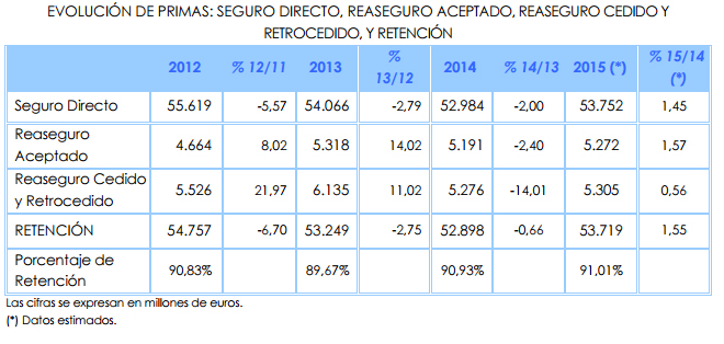 Al cierre del pasado año el volumen de primas cedido al reaseguro por las aseguradoras del mercado español se aproximó a los 5.305 millones de euros, lo que equivale a un porcentaje de retención del 91,01% sobre las primas de seguro directo y aceptado. Los datos del ‘Informe del Sector 2015’ de la DGSFP son estimados, pero en cualquier caso “se hace patente en el mercado español un porcentaje de retención elevado, superior al 90 por ciento”. Asimismo, los datos estimados para 2015 “pronostican un ligero aumento de las primas en todas las modalidades de reaseguro con respecto a 2014, invirtiéndose la tendencia observada de 2013 a 2014”.