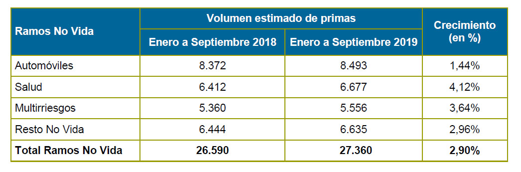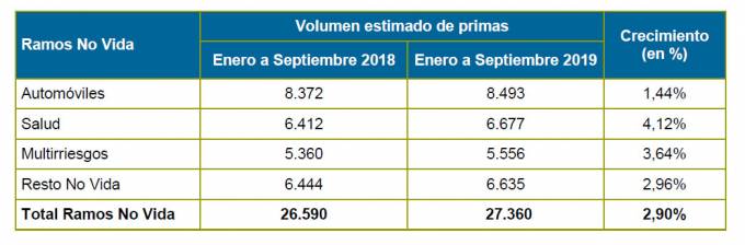 El seguro español ha obtenido un volumen de primas de 48.327 millones de euros al cierre del tercer trimestre de 2019, lo que significa un ligero incremento del 0,23% en relación al mismo periodo del ejercicio anterior, por lo que se rompe así la tendencia a la baja que se estaba registrando a lo largo de este año, según muestran los datos provisionales recabados por ICEA y publicados por Unespa.