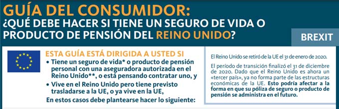 Eiopa ha elaborado una Guía para dar a conocer a los asegurados cómo proceder después de que el Brexit se haya hecho efectivo el pasado 31 de enero después del mes de transición. Estas recomendaciones van dirigidas a quienes tengan un seguro de Vida o un producto de Pensiones con una aseguradora autorizada en el Reino Unido y también a quienes viviendo allí tienen pensando residir próximamente en la Unión Europea o ya lo hacen.