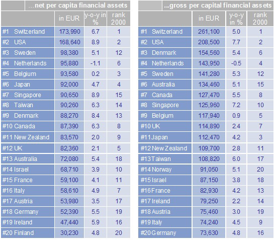 Los activos/recursos financieros netos crecieron un 3,9% en 2017, también ligeramente más que en 2016 (3,5%). Con un activo financiero neto per cápita de 29.740 euros, España ocupa el puesto 22 en la lista de los países más ricos, desciende un escalón respecto al año anterior e intercambia su lugar con Corea del Sur.