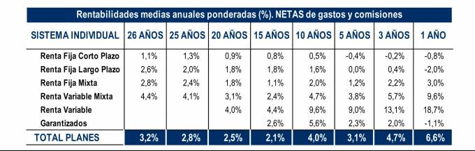 Los datos avanzados por Inverco al cierre de enero sitúan la rentabilidad a 1 año de los Planes de Pensiones en el 6,6%. Para el largo plazo (25 años), registran una rentabilidad media anual del 2,8% mientras para el medio plazo (10 y 15 años), presentan una rentabilidad del 4% y 2,1% respectivamente. De nuevo la Renta Variable ofrece retornos elevados, del 9,6% anual a 10 años y más del 18,5% en un año.