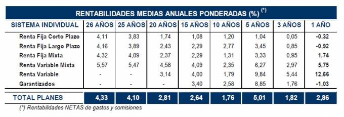 La rentabilidad de los Planes de renta variable sigue siendo muy elevada. Los Planes de Renta Variable y Renta Variable Mixta acumulan una rentabilidad interanual del 12,66% y del 5,75%, respectivamente.