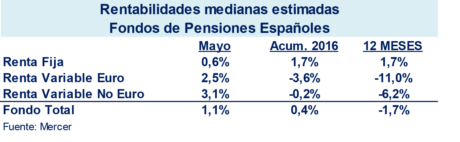 Los Fondos de Pensiones de Empleo españoles tuvieron una rentabilidad mediana del 1,1% en mayo, según los datos del informe PIPS de Mercer. La rentabilidad acumulada hasta mayo es del 0,1%, mientras en los últimos 12 meses se sitúa en el -1,7%.