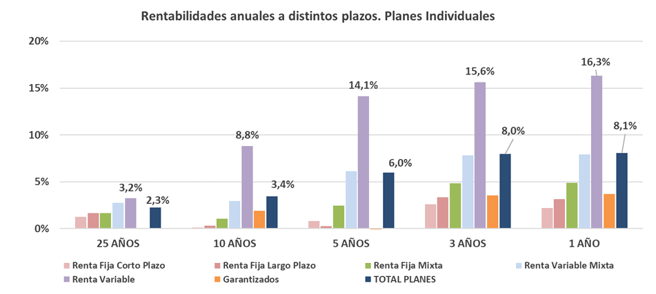 Por su parte, la rentabilidad interanual para el conjunto de Planes se situó por encima del 8%. Destaca la categoría de Renta Variable que obtuvo una revalorización del 16,3%, y los Renta Variable Mixta con el 7,9%. A más largo plazo (5 años) la categoría de Renta Variable aporta una rentabilidad media anual del 14,1% y superior al 9% a 15 años.