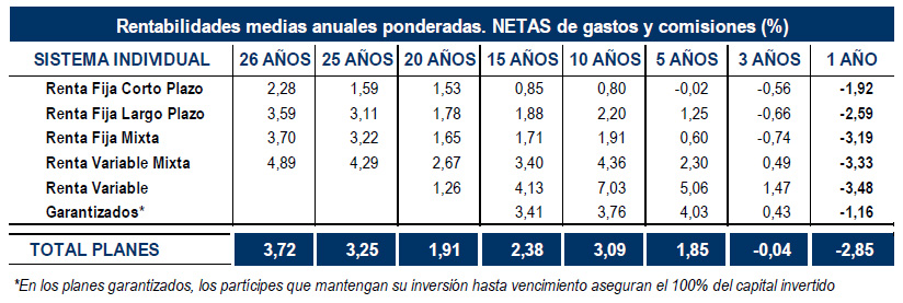 La rentabilidad media anual a 1 año de los Planes de Pensiones se sitúa en el -2,85%