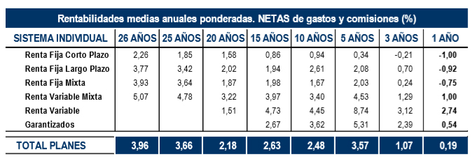 En el largo plazo, los Planes de Pensiones registraron una rentabilidad media anual (neta de gastos y comisiones) del 3,96% para el total de Planes. Asimismo, en el medio plazo (5 y 10 años), los Planes de Pensiones presentaron una rentabilidad media anual del 3,57% y del 2,48%, respectivamente.