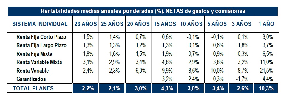 También las rentabilidades en el medio-largo plazo se mantienen positivas. Por ejemplo, a 20 años, los Planes de Pensiones registran una rentabilidad media anual (neta de gastos) del 3% y, en el medio plazo (10 y 15 años), presentan una rentabilidad del 3% y 4,3% respectivamente.