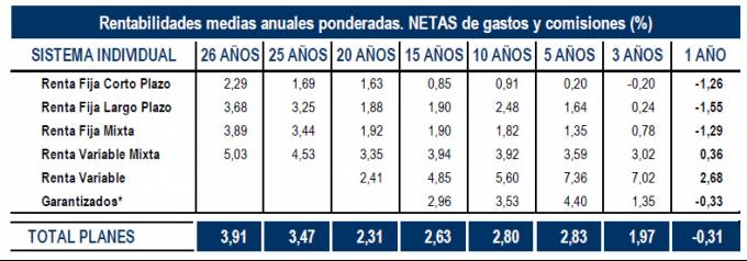 A pesar de la volatilidad en los mercados financieros, los Planes de Pensiones de Renta Variable experimentan en septiembre rentabilidades interanuales positivas del 2,68%, si bien el total de los Planes individuales sitúan su rentabilidad interanual en el -0,31%, según los datos de Inverco. En el largo plazo, los Planes de Pensiones registran una rentabilidad media ponderada anual (neta de gastos y comisiones) del 3,9% y, en el medio plazo (5 y 10 años), presentan una rentabilidad del 2,83% y del 2,80%, respectivamente. Las aportaciones brutas sumaron 188,6 millones de euros y las prestaciones 185,9 millones, con lo que el volumen de aportaciones netas del mes alcanzaría los 2,7 millones de euros.