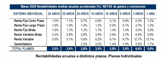 La rentabilidad de los Planes de Pensiones del sistema individual cae ligeramente en marzo al 5,8%