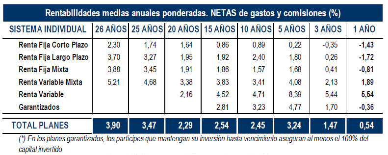 A pesar de la volatilidad en los mercados financieros, los Planes de Pensiones de Renta Variable y los de Renta Variable Mixta experimentan en agosto rentabilidades interanuales positivas del 5,54% y del 1,89%, respectivamente. De media, los Planes de Pensiones del Sistema Individual sitúan su rentabilidad interanual en el 0,54%. En el largo plazo, registran una rentabilidad media anual (neta de gastos y comisiones) del 3,90% para el total de Planes. En el medio plazo (5 y 10 años) los Planes de Pensiones presentan una rentabilidad media anual del 3,24% y del 2,45%, respectivamente.