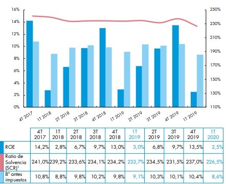También se ha incrementado la cuenta técnica de Salud, que ha crecido 1,8 puntos (5,4%) por la mejora del margen técnico que contrasta así el descenso que sufrió el margen financiero. Por el contrario, la cuenta técnica de Multirriesgo Hogar cayó casi 6 puntos en el primer trimestre de 2020, situándose en el 4,2%, debido al deterioro tanto del margen técnico (en buena parte por inclemencias meteorológicas) como del financiero.