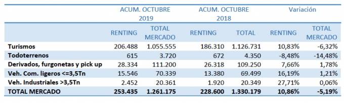 El renting sigue en crecimiento, acumula ya un crecimiento del 10,86% y supone en el 20,10% de las matriculaciones de automóviles con 253.435 automóviles matriculados hasta octubre, según los datos publicados por la Asociación Española de Renting.