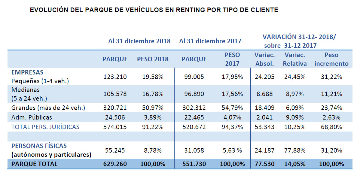 De estos 77.530 automóviles, las pequeñas empresas (aquéllas que cuentan con menos de 5 vehículos) aportaron 24.205 unidades (+24,45%) y las personas físicas –autónomos y particulares–, 24.187 (+77,88%). Es decir, estos dos colectivos acaparan el 62,42% del crecimiento del parque. Agustín García se ha mostrado especialmente satisfecho con la evolución del renting entre las personas físicas, donde el parque ya asciende a 55.245 vehículos: "Ha sido la gran sorpresa y esperamos que se consolide en el futuro. De momento, estamos expectantes y ojalá podamos decir en 2020 que ha crecido en 30 unidades". Y ha añadido: "El renting ha dejado de ser el gran desconocido, del que se hablaba como solución exclusiva para el mundo empresarial, y ya es una opción real para todas las personas que quieran optar por una movilidad más racional, sin renunciar a la comodidad".