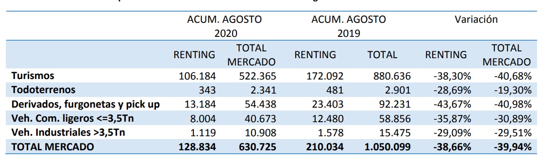 Las matriculaciones en renting en el mes de agosto vuelven a las cifras de 2019. Tan solo se han matriculado 78 vehículos menos que en el mismo mes del año anterior a pesar de que el acumulado del año sea todavía un 38,66% inferior al pasado ejercicio. Su peso en el total del mercado sigue incrementándose y supone ya el 20,43% según datos de la AER.