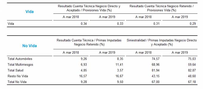 Por ramos, el resultado de la cuenta técnica de Autos desciende del 9,26% al 8,35%; la de Multirriesgos mejora del 6,93% al 11,41%. En Salud baja desde el 4,85% al 3,57%, mientras en el 'Resto No Vida' pasa del 16,57% al 16,67%.