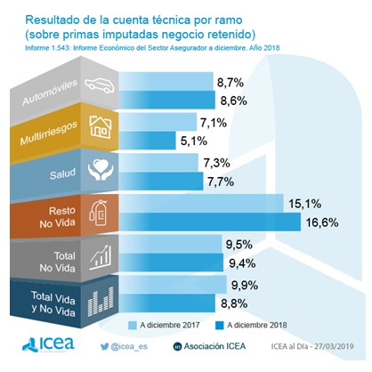 La cuenta técnica del seguro arrojó un resultado del 8,8% a diciembre de 2018, un punto y una décima inferior al índice obtenido un año antes, expresado en términos de sus primas imputadas retenidas, según los datos facilitados por ICEA. Ese descenso se debe de nuevo a que desaparece el efecto positivo generado por el negocio reasegurador, concretamente de reaseguro cedido y procedente del ramo de Vida. La tasa de siniestralidad del negocio directo, incluyendo el reaseguro aceptado, fue del 75,5% de las primas imputadas, tres puntos y una décima por debajo de la que hubo a diciembre de 2017.