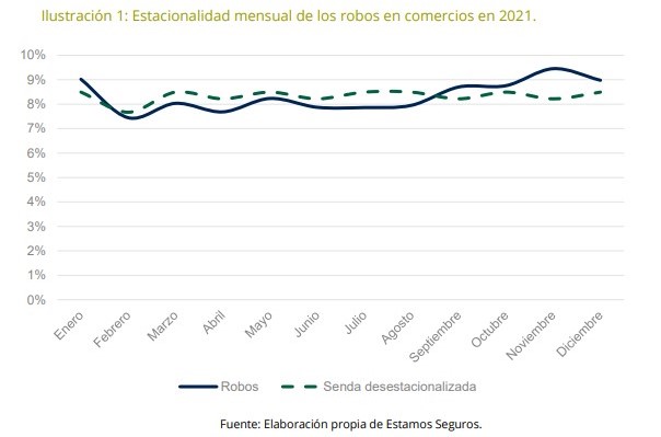 Según revela este informe, el año pasado se recuperó la dinámica tradicional con delitos repartidos regularmente a lo largo del año, salvo por un ligero repunte en noviembre. El año 2020 resultó atípico por las medidas declaradas para contener la pandemia de Covid-19. Aquel ejercicio los robos cayeron significativamente durante las semanas de confinamiento.