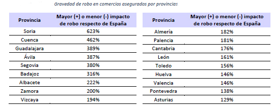 La información reunida también permite conocer cuáles fueron los robos de mayor impacto. Para ello, se pone en relación la cuantía de la indemnización pagada por la aseguradora con el límite de la protección contratada por el comerciante. Desde esta óptica, se descubre que los robos más graves se dan en Soria. Ahí, la visita de los ladrones tiene siete veces más impacto que en el conjunto de España (623%). Completan la clasificación Cuenca (462%) y Guadalajara (389%). En comparación, el impacto de los robos en comercios de las Islas Baleares es muy pequeño (-94%).