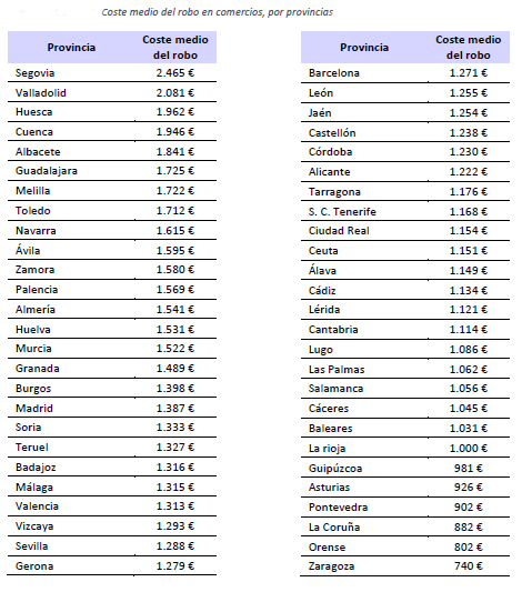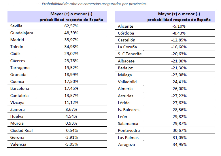 Sevilla es la provincia donde es más probable padecer un incidente de este tipo. En concreto, es un 63% más habitual que un comerciante sufra ahí un robo que en el conjunto de España. Le siguen en la clasificación 3 provincias del centro peninsular: Guadalajara (48%), Madrid, (36%) y Toledo (35%). La provincia más segura es Teruel, donde la probabilidad de padecer un robo en una tienda es un 72% más baja que la del conjunto de España. Le siguen Segovia (-61%) y Palencia (-54%).