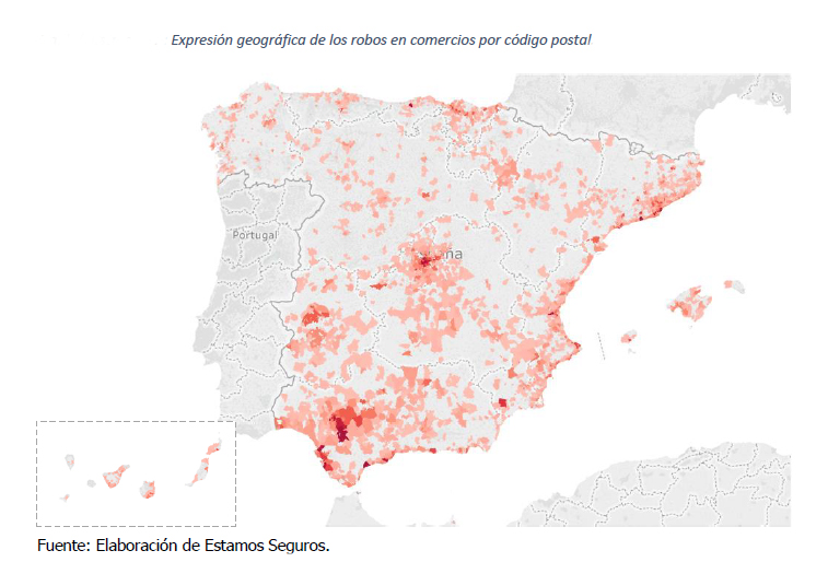 La mitad de los robos en tiendas aseguradas ocurre en 5 provincias: Barcelona, Madrid, Sevilla, Valencia y Vizcaya. Sin embargo, estas 5 provincias juntas suman apenas el 40% de los comercios que existen en el país. La diferencia entre una y otra medida es de 10 puntos porcentuales. Como estas provincias albergan, precisamente, los municipios de mayor tamaño del país, se puede afirmar que los robos en establecimientos de venta al por menor son un fenómeno más habitual en las grandes ciudades que en localidades pequeñas.