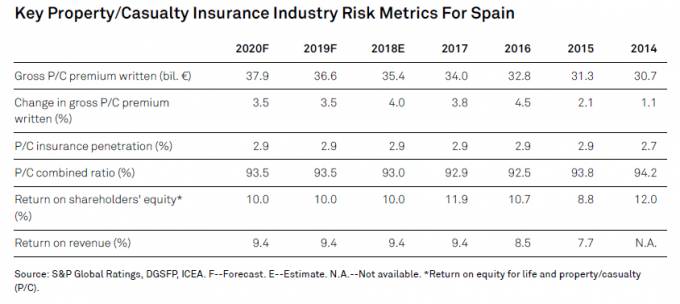 En cambio, en No Vida, la agencia señala que el riesgo es bajo y prevé que el crecimiento económico siga apoyando a su vez el incremento del volumen de primas. Y afirma S&P que "también esperamos que el sector siga reportando un desempeño técnico sólido durante 2018-2019, beneficiándose de la probada disciplina de suscripción, previsibilidad de reclamaciones y la baja exposición a riesgos catastróficos". Sí admite que su valoración a medio plazo podría rebajarse debido al aumento del nivel de competencia y el consiguiente aumento y volatilidad de las reclamaciones sobre primas. En todo caso, "el mercado español de No Vida es el único en Europa cuyo riesgo de producto consideramos positivo". Destaca que la importancia del Baremo y la reducción de la exposición por riesgos de catástrofes naturales gracias a la existencia del Consorcio de Compensación de Seguros.