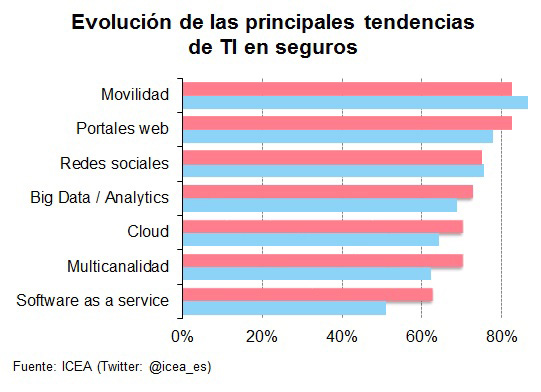 Las tendencias de TI que más interesan a los CIO de seguros son la movilidad, los portales, las redes sociales, el big data, la multicanalidad y el cloud, según datos de ICEA. Respecto al año anterior, destaca el crecimiento en importancia del SaaS (Software as a Service), relacionado con el cloud; la multicanalidad y el propio cloud. También reseñables son los incrementos de temas como los portales y el big data.