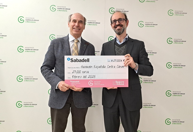 Sabadell Seguros ha donado 27.000 euros a la Asociación Española Contra el Cáncer (AECC). Bernardino Gómez, director general de BanSabadell Seguros Generales, Vida y Pensiones, entregó un cheque por ese importe a Laureano Molins, presidente de la Associació Contra el Càncer a Barcelona, para colaborar en dos proyectos diferentes: el 'Proyecto Integral a Mujer con Cáncer' y 'Cáncer de próstata localizado: ¿qué tratamiento escoger?'.