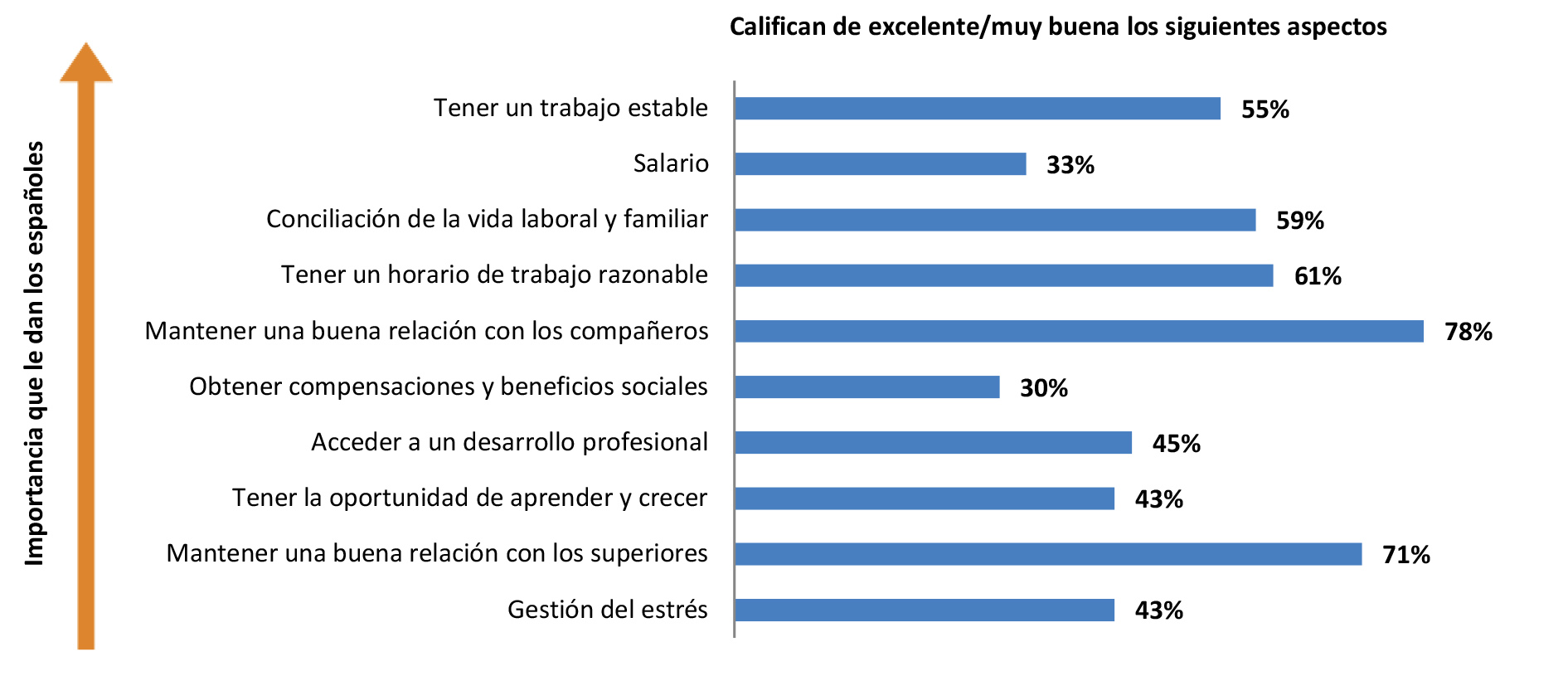 En España, la seguridad de tener un puesto de trabajo estable, el salario y la conciliación de la vida personal y laboral son por ese orden las cuestiones a las que más importancia dan los españoles a la hora de tener salud y bienestar en el trabajo. Sobre su percepción sobre su situación actual, los aspectos que mejor califican de sus empresas es la buena relación con los compañeros (78%), mantener una relación fluida con los superiores (71%) y tener un horario razonable (61%). Además, llama la atención el hecho de que el salario sea uno de los puntos considerados como muy importantes por los empleados pero que solo una tercera parte reconozca estar satisfecho con su sueldo mensual.