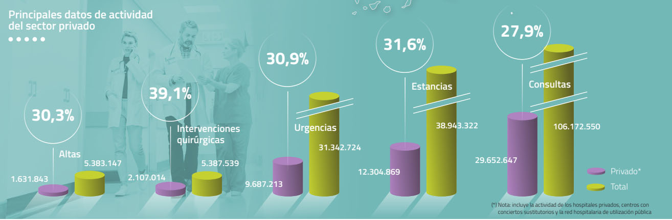 En España, el 56% de los hospitales -431 hospitales- y 3 de cada 10 camas son privadas. Además, los centros privados realizan entre el 27% y el 39% de la actividad hospitalaria del Sistema Nacional de Salud. Esto supone el 40% de las intervenciones quirúrgicas, 3 de cada 10 urgencias y el mismo porcentaje de altas.
