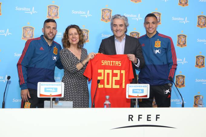 El acto de renovación del acuerdo ha tenido lugar en la Ciudad del Fútbol de Las Rozas con la presencia de Iñaki Ereño, consejero delegado de Sanitas, y Ana Muñoz, vicepresidenta para Asuntos de Integridad de la Real Federación Española de Fútbol además de los jugadores Jordi Alba y Rodrigo Moreno, de la selección absoluta masculina.