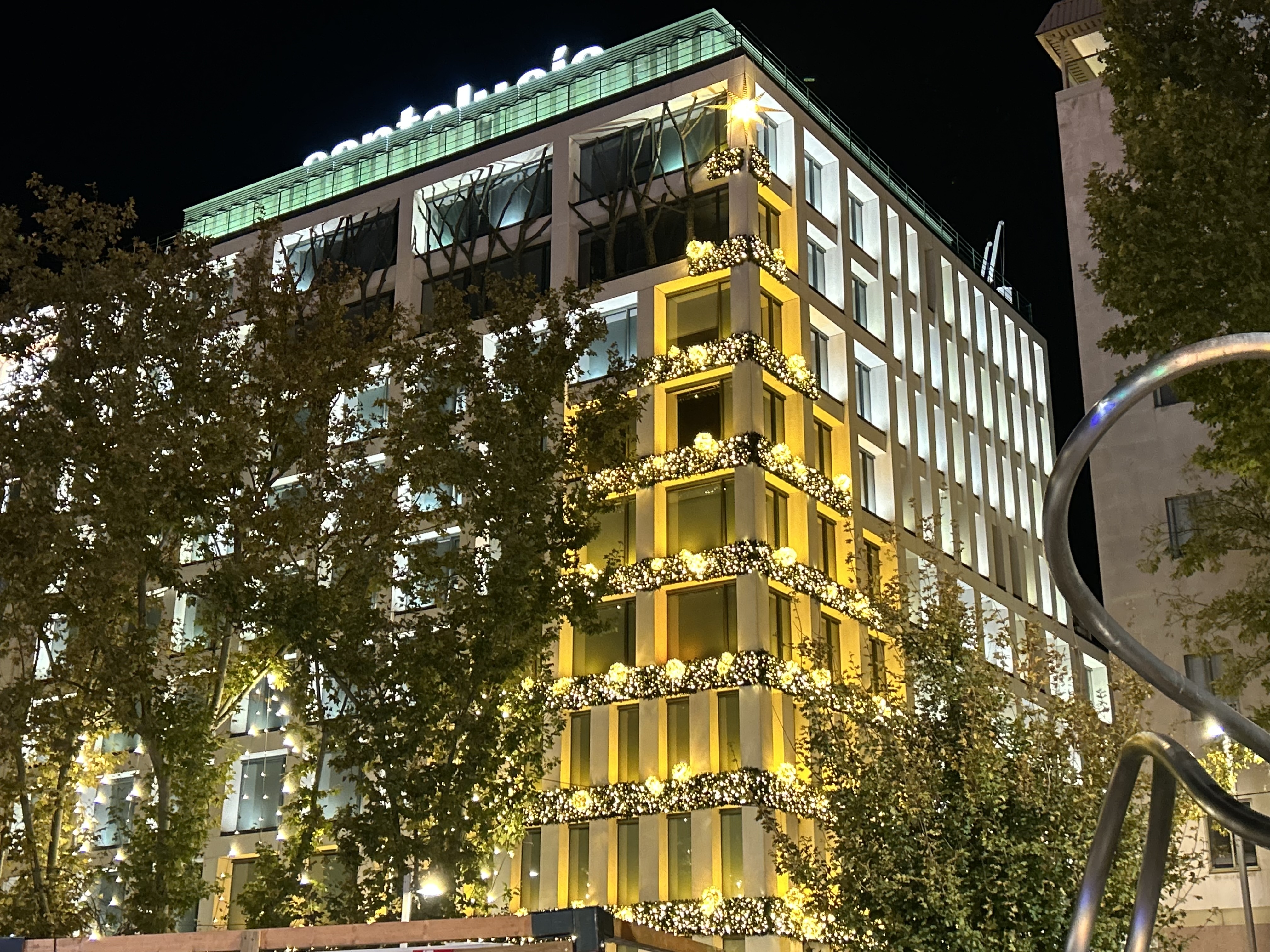 Santalucía ha iluminado su sede en la Plaza de España de Madrid con motivo de la Navidad. Lo ha hecho con más de 55 kilómetros de luz led y 4 kilómetros de guirnalda de abeto. Además, la aseguradora patrocinó el concierto al aire libre del grupo Taburete en 'La Navideña'.
