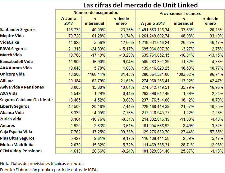 El sector asegurador lleva tiempo apostando por los unit linked para sortear en el ramo de Vida el prolongado contexto de bajos tipos de interés. Pero este afán por colocar productos en los que es el tomador el que asume el riesgo y no la aseguradora ha chocado con la tradicional prudencia del ahorrador español. Al menos hasta ahora. Si bien es cierto que en tasa interanual el volumen de provisiones técnicas gestionados por estos productos ha seguido cayendo, un 2,5% entre enero y junio hasta los 12.913 millones, también lo es que en lo que va de año se ha apreciado un revelador avance, y han crecido un 2,32%. Eso sí, el número de asegurados continua cayendo, un 5,66%, según los últimos datos de ICEA.