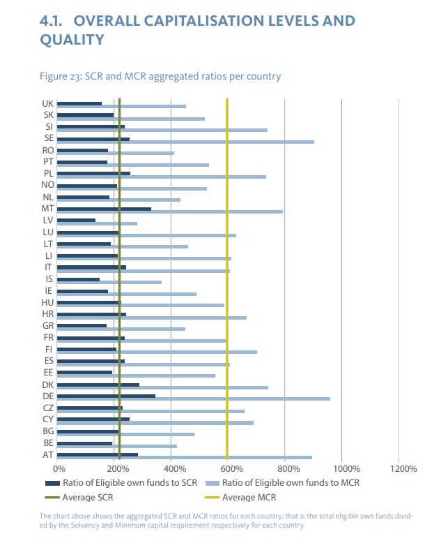 El SCR (Solvency capital requirement) agregado del seguro europeo se sitúa en el 220%. Según el informe de Eiopa 'European insurance overview 2018' con datos de finales de 2017 incluyendo únicamente a entidades, la media de SCR está